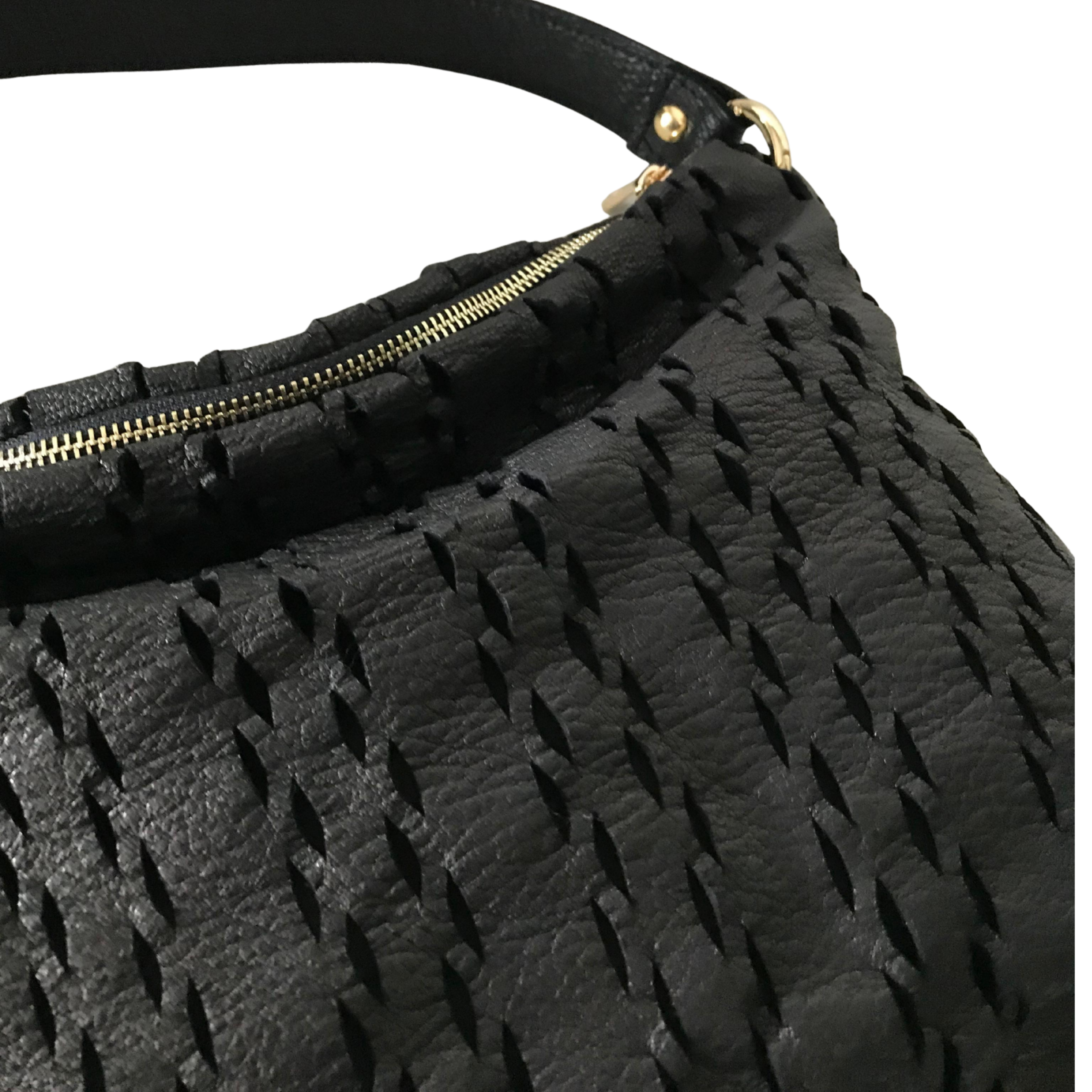 Borsa a spalla in pelle nera con raffinata lavorazione intrecciata, dal design morbido e contemporaneo. Un accessorio sofisticato e versatile, perfetto per valorizzare ogni look, dal giorno alla sera.