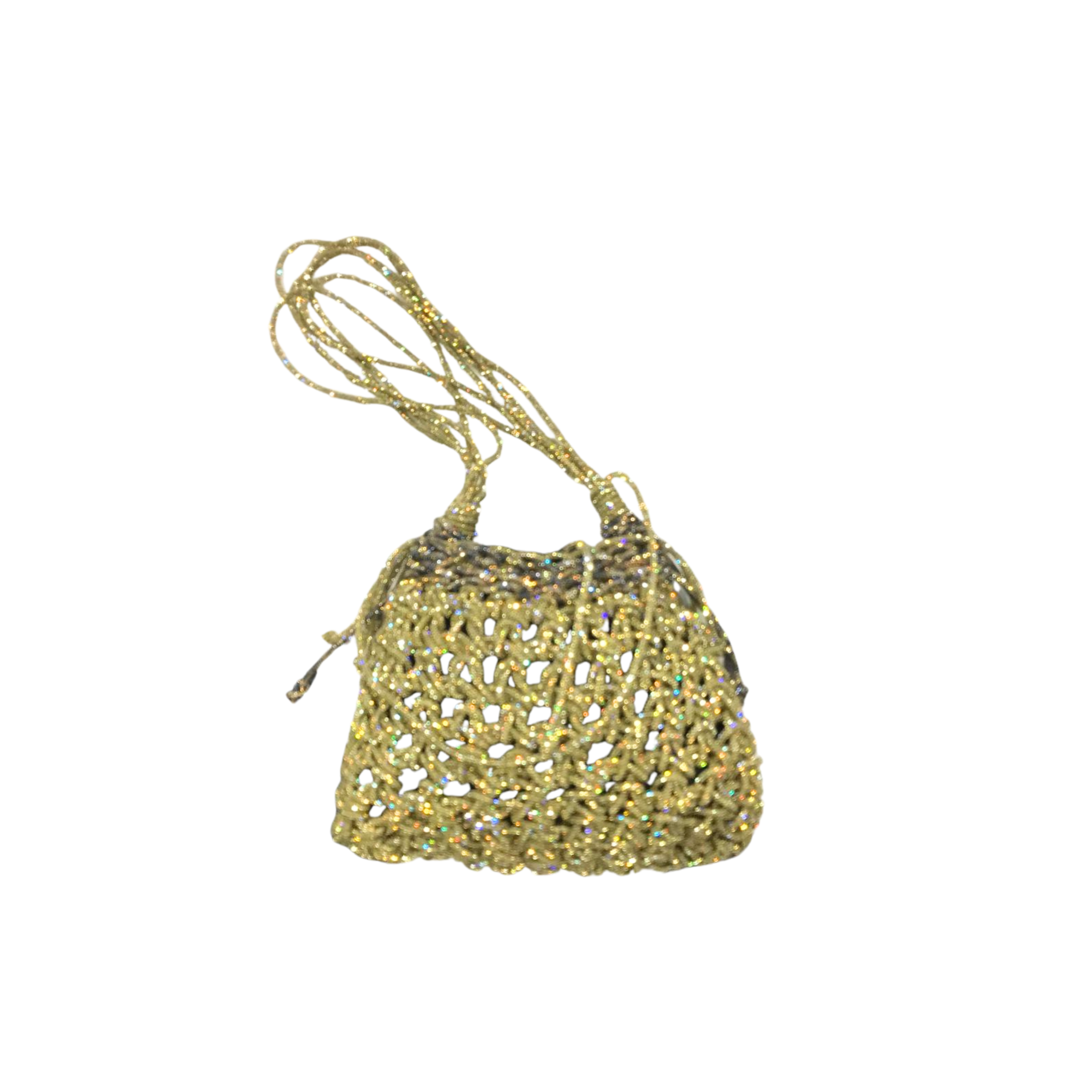 Realizzata a mano con cura e attenzione ai dettagli, questa pochette combina la bellezza del lavoro all’uncinetto con la brillantezza degli strass, creando un effetto luminoso e raffinato. Il pratico cordoncino permette una chiusura sicura e aggiunge un tocco moderno e versatile.