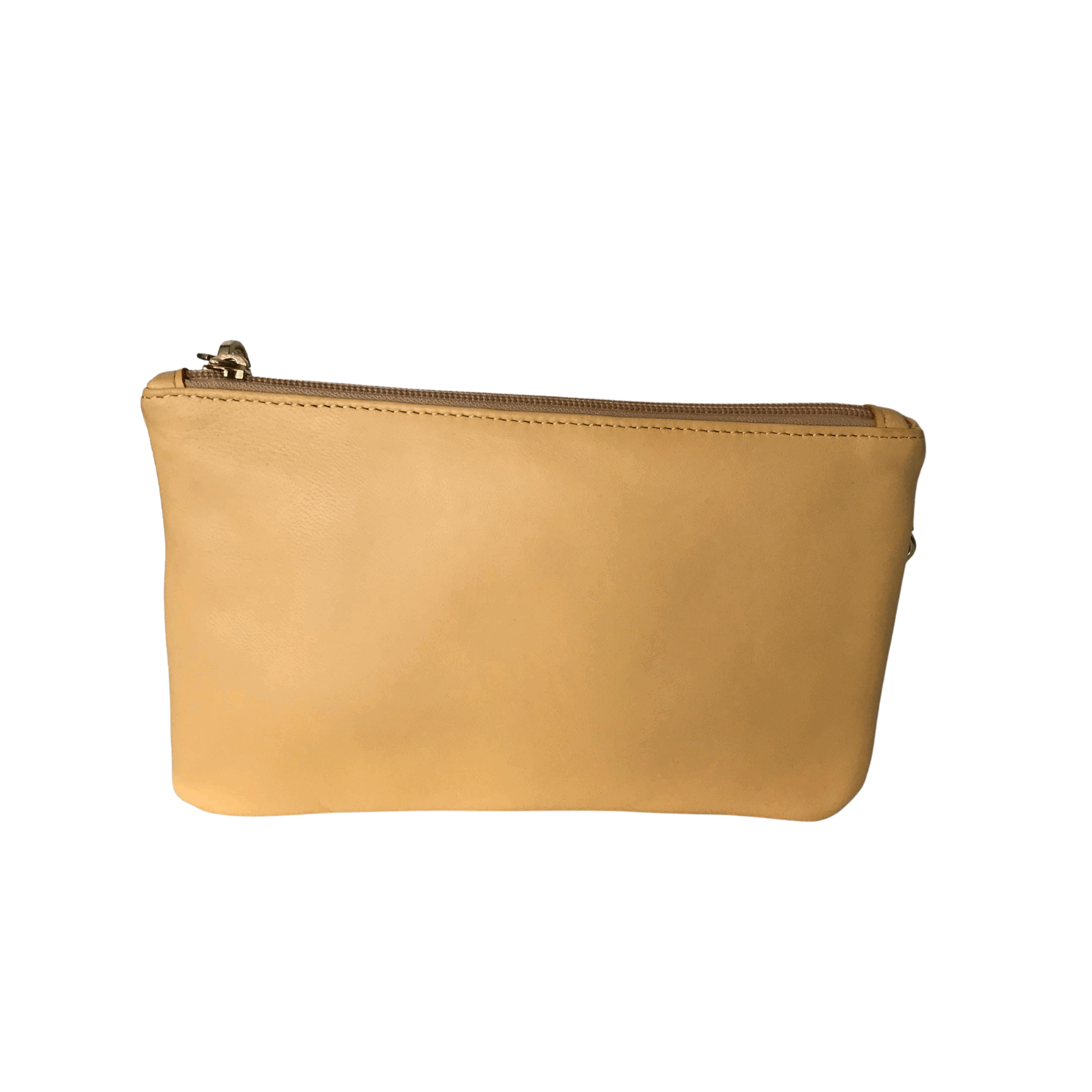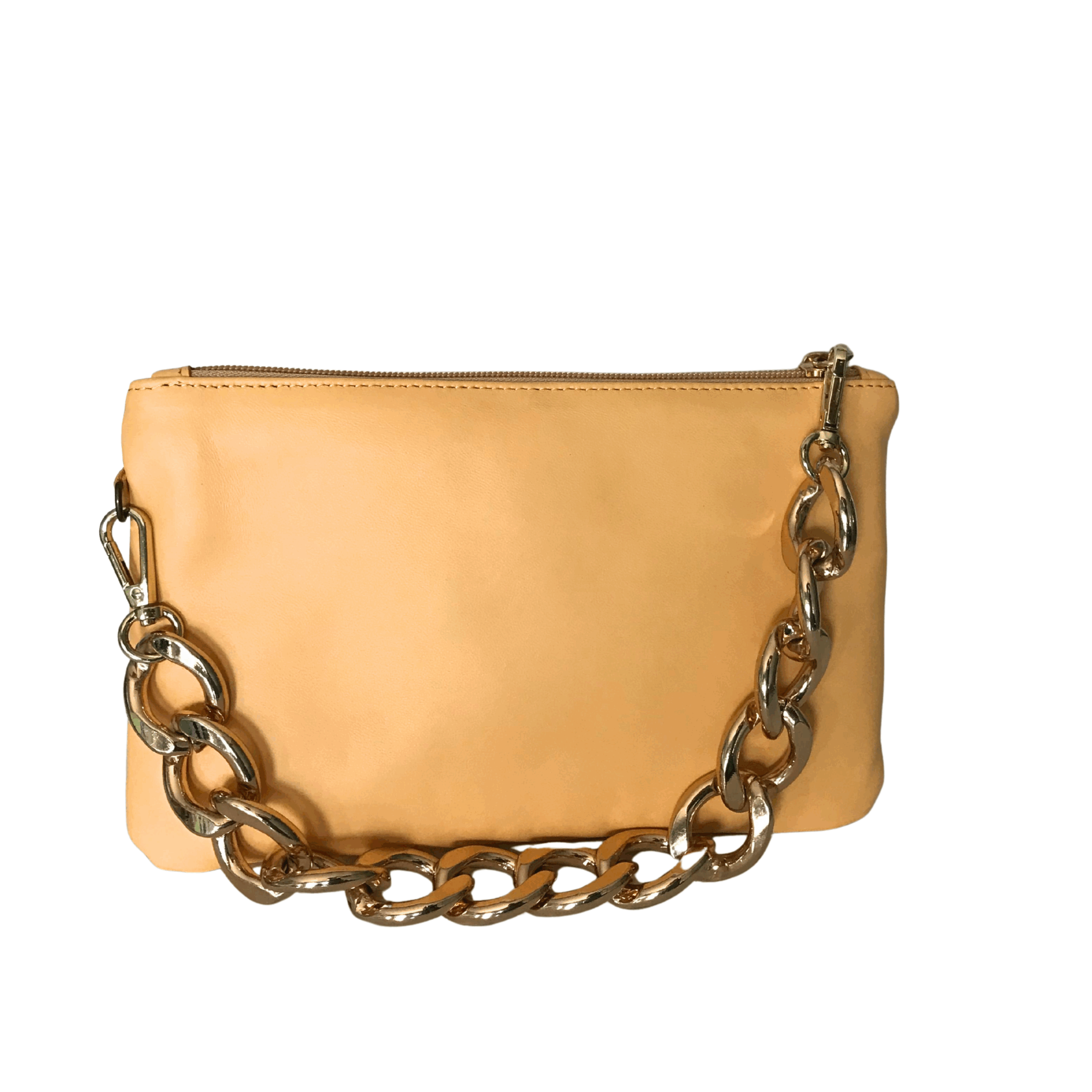 Pochette dal design semplice ed elegante. Il colore è un senape caldo, originale e deciso, perfetto per dare un tocco di colore a un outfit neutro o per completare un look serale. La chiusura superiore è con zip dorata, che aggiunge un dettaglio raffinato. Ai lati sono presenti piccoli anelli metallici dorati, pensati per agganciare una tracolla rimovibile. È una borsa compatta, adatta per contenere l’essenziale: portafoglio, telefono, chiavi e un rossetto. Ideale per occasioni informali, aperitivi, eventi o uscite serali.