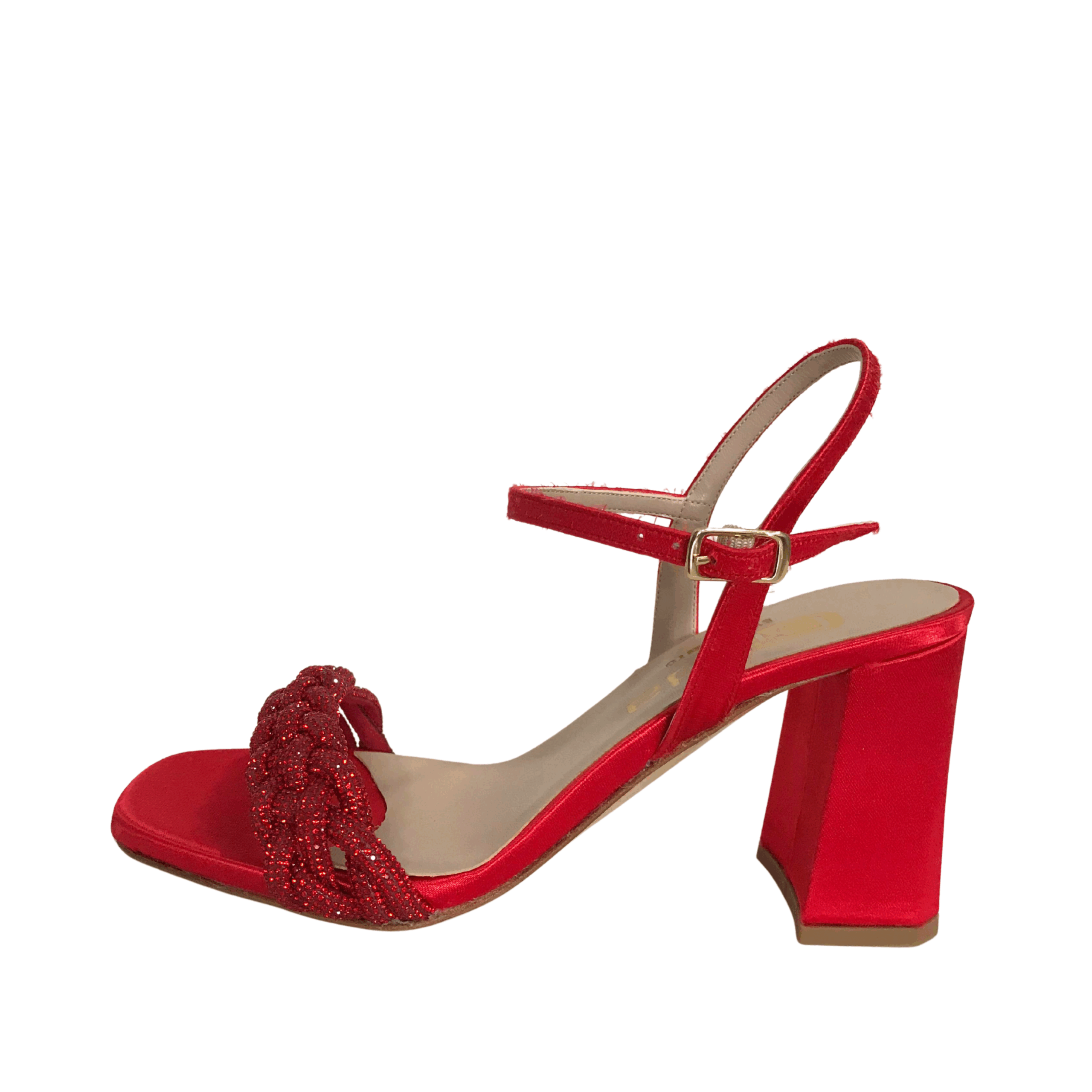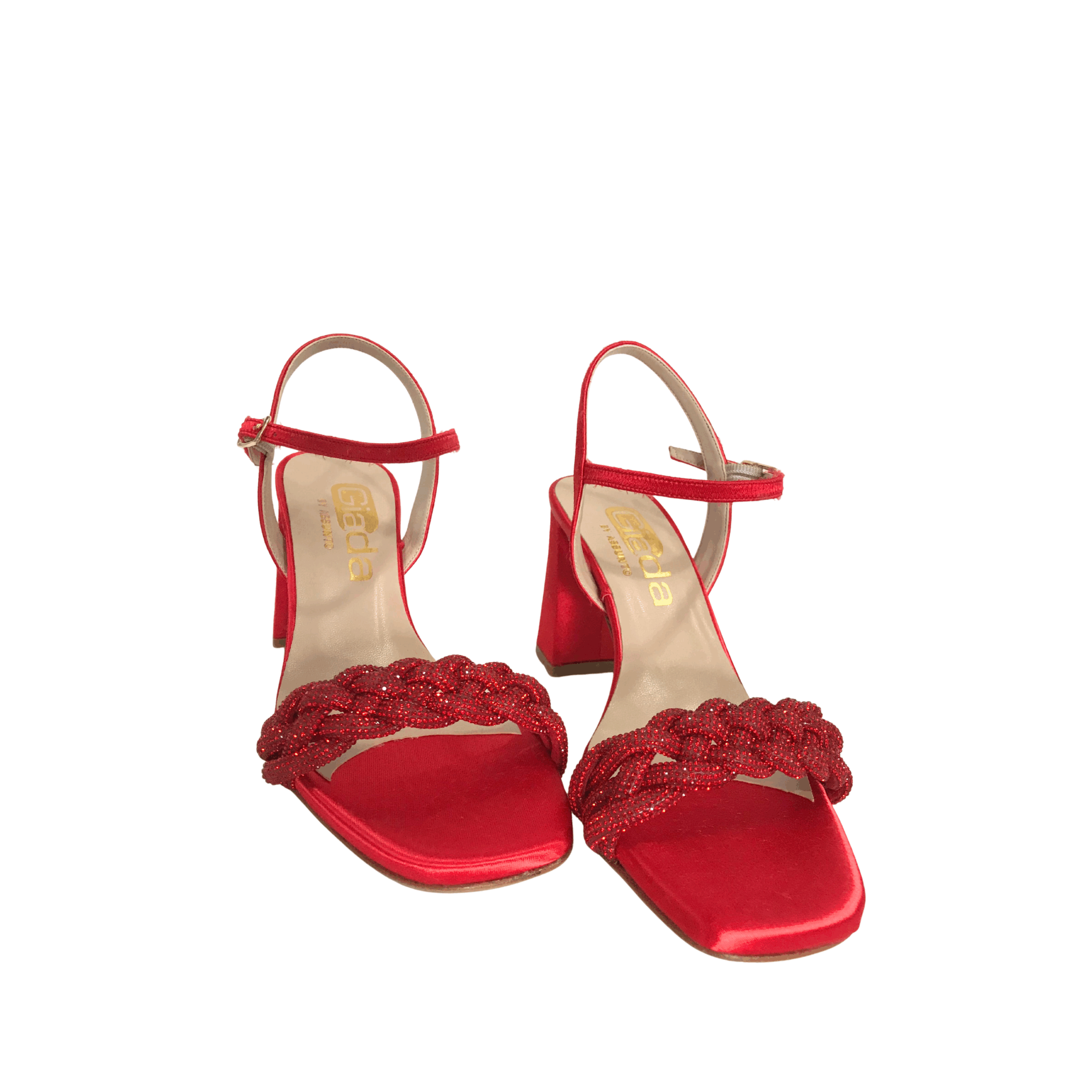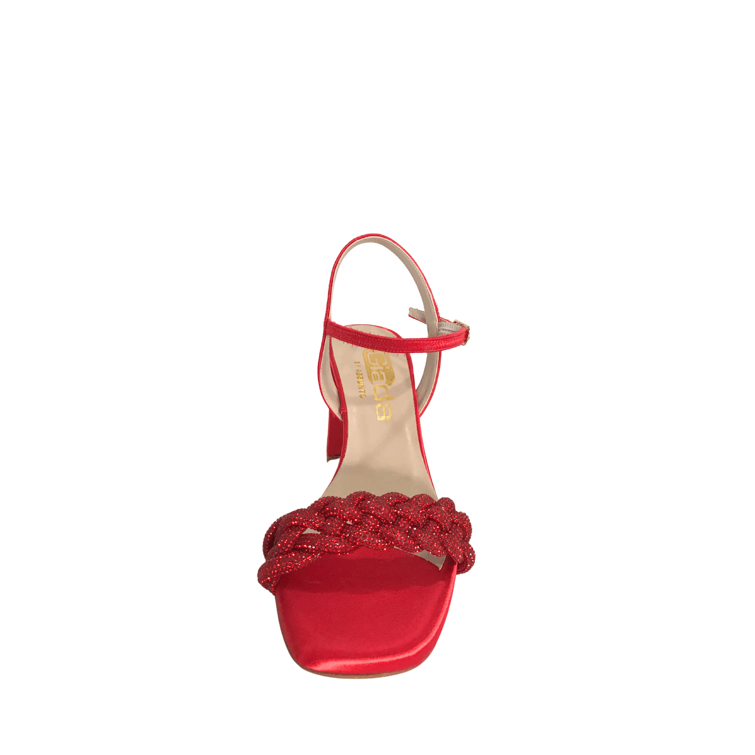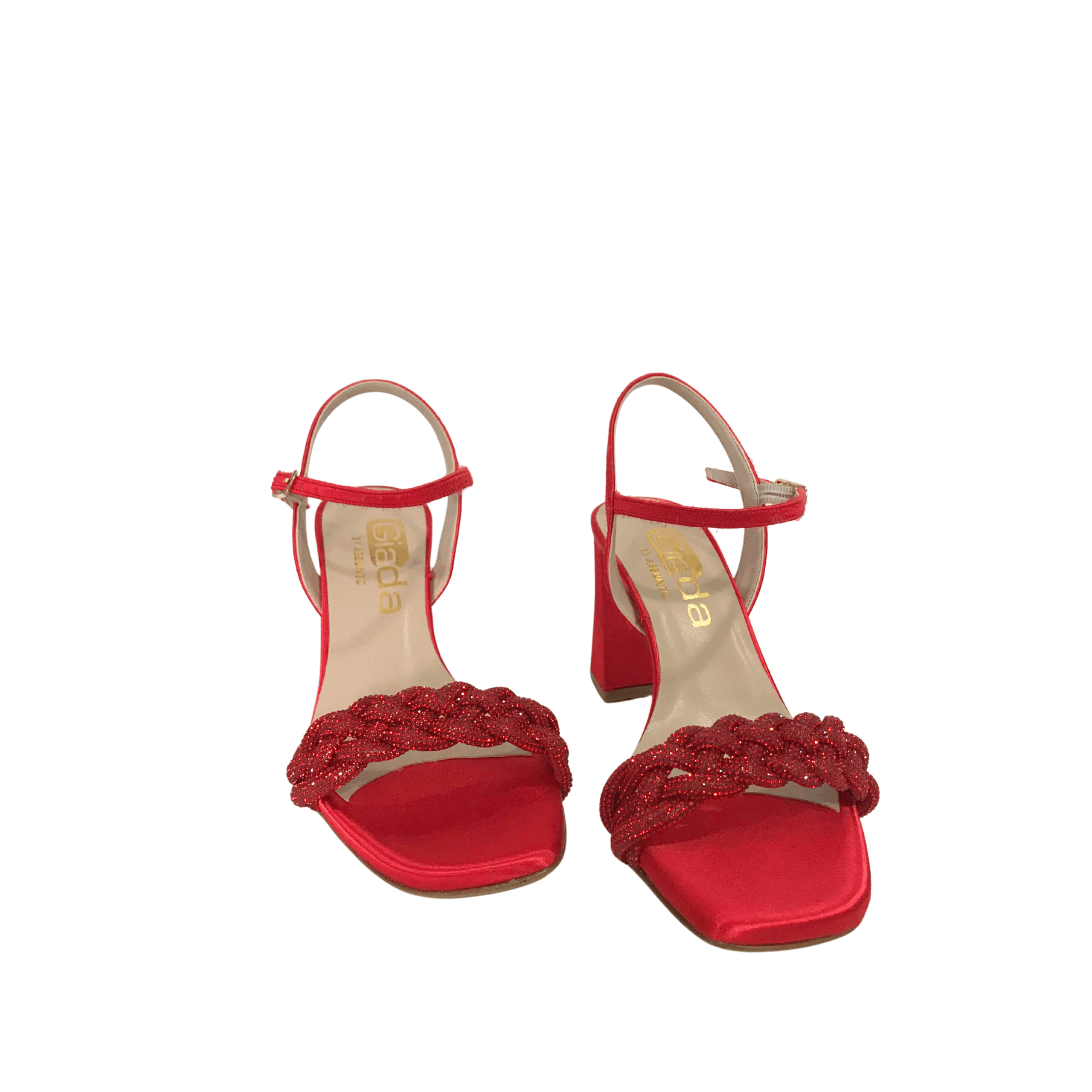 Aggiungi un tocco di eleganza vivace al tuo look con questi raffinati sandali rossi firmati Giada Shoes. Realizzati in raso e impreziositi da una fascia anteriore intrecciata con dettagli glitterati, questi sandali esprimono tutta la qualità e lo stile del vero Made in Italy.